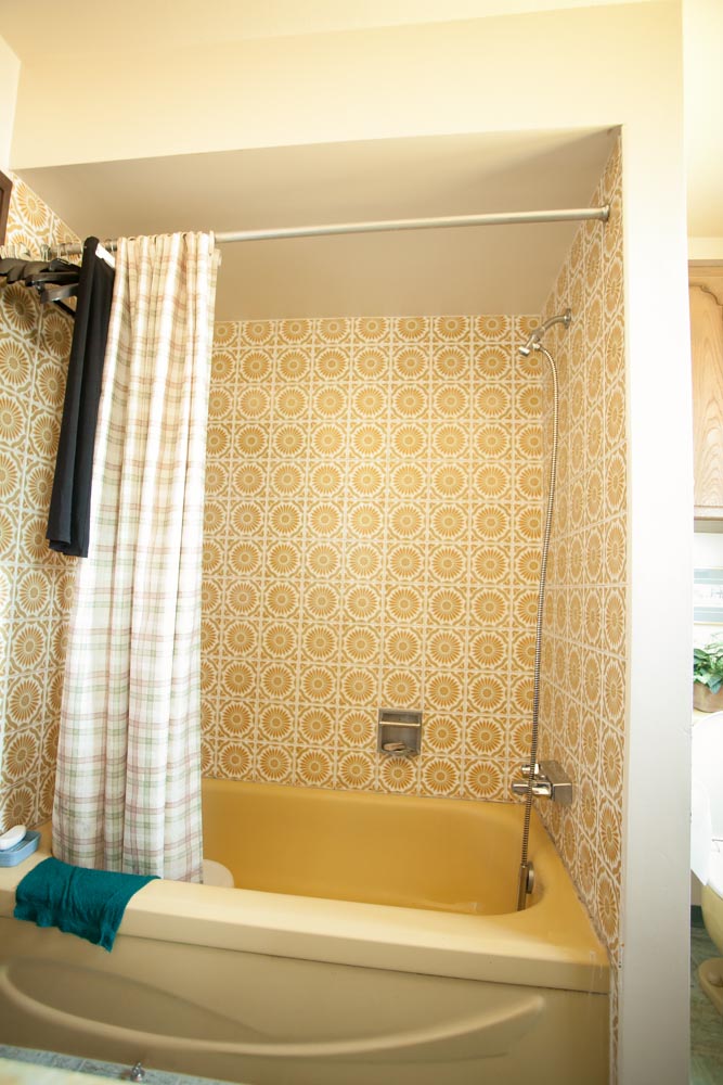 The bathroom was given a complete face lift. The old tub was taken out and replaced with a standing shower to create more room, the floor was re-tiled and tile was added to the bathroom walls.