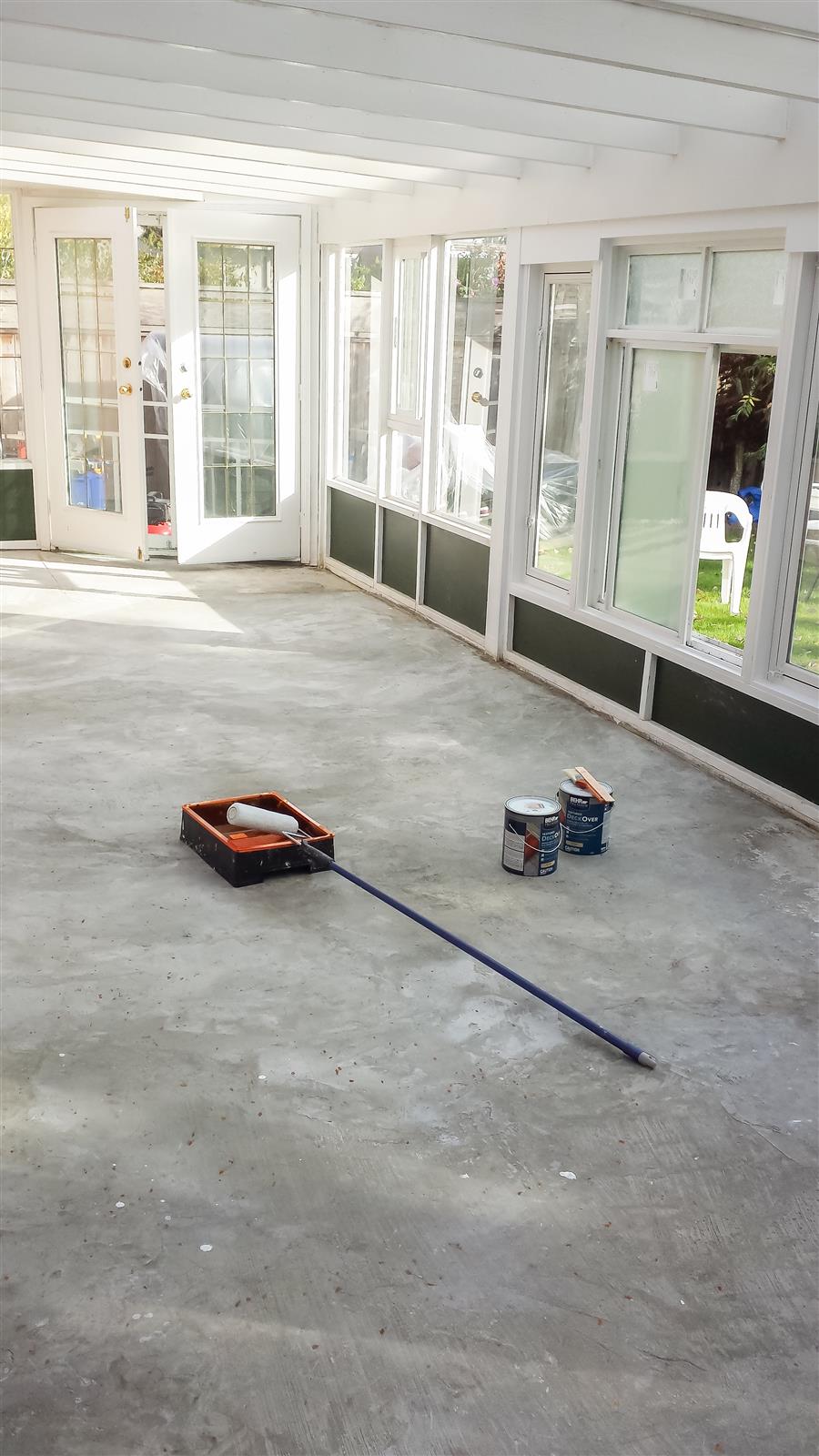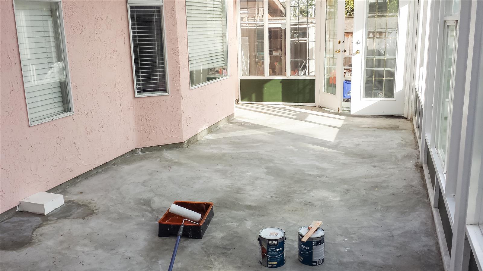 All the carpet and mold was removed and cleaned up. The flooring was rejuvenated with a fresh coat of grey paint and an added slip-resistant finish to it, which works well for a workout room.