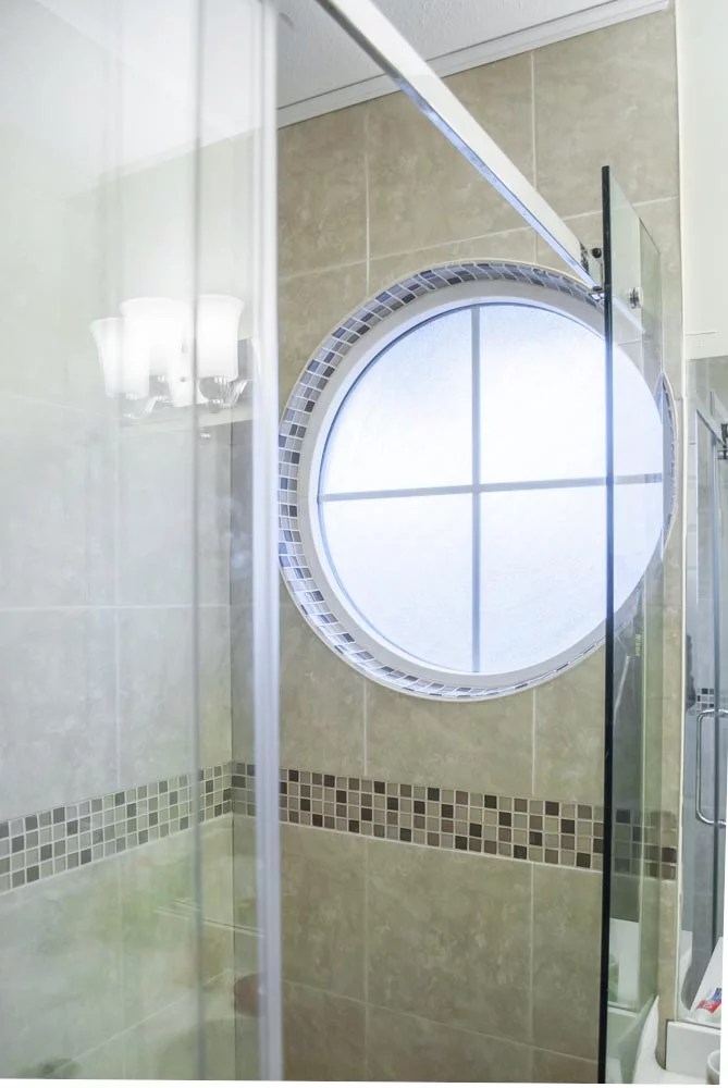 Grab bars were added for easier access to the shower as well as a sliding glass door for a more modern look and to make the area look bigger.